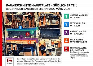 Um eine rasche Nutzung der sommerlichen Gastgärten zu gewährleisten, wird entlang der „Gastromeile im südwestlichen Bereich“ zuerst begonnen. Im Oktober wird der gesamte Hauptplatz in neuem Glanz erstrahlen.