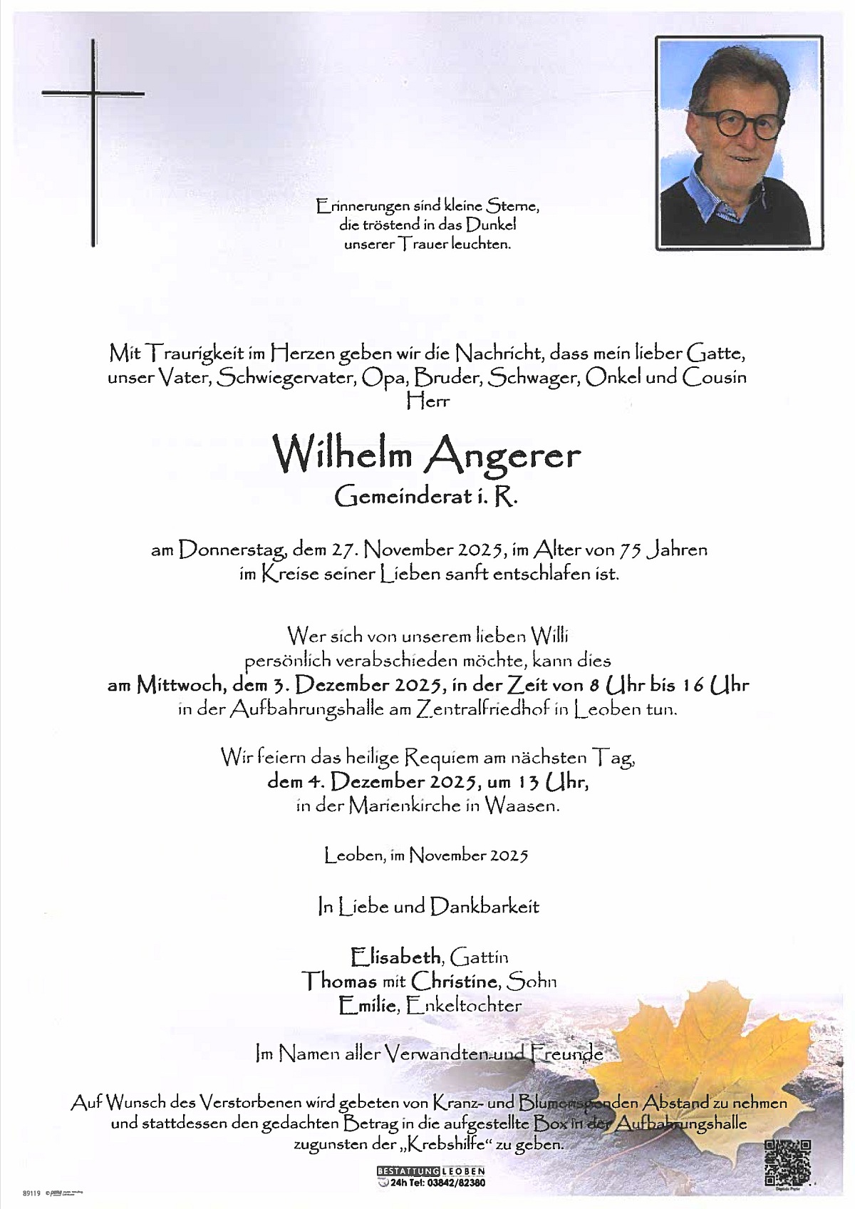 Mit großer Betroffenheit teilt die Stadt Leoben mit, dass Herr Wilhelm Angerer, als langjähriger Gemeinderat für seine herausragenden gesellschaftspolitischen Verdienste und sein jahrzehntelanges Wirken zum Wohle der Menschen in Leoben mit dem Goldenen Ehrenzeichen der Stadtgemeinde Leoben ausgezeichnet, im Alter von 75 Jahren verstorben ist.