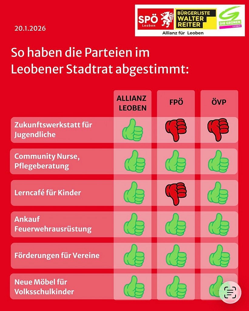 Die Stadt Leoben stellt im Rahmen der Subventionen gezielt Mittel für Vereine und Organisationen bereit, die einen wichtigen Beitrag für das kulturelle, soziale und sportliche Leben leisten. Unterstützt werden unter anderem der Musikverein Leoben für das Faschingskonzert sowie der Gösser Musikverein, insbesondere für die Anschaffung neuer Instrumente und Uniformen. Der Stadtchor Leoben erhält eine Förderung zur Abdeckung der Mietkosten für das neue Vereinslokal in der Langgasse.